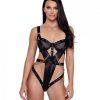 Teddy: • Floral guipure lace trim & illusion tulle • 3-Ring Metal Hardware • Demi cup with underwire • Hook & eye closure • Steel boning • Single string thong back • Cotton gusset