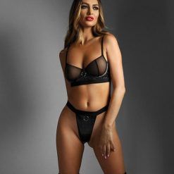 Edge Quilted Wetlook And Mesh Longline Underwire Bra W/ G-string – Black S/m