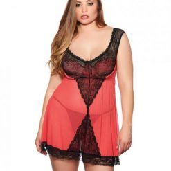 Holiday Lace, Mesh Babydoll & Panty Red Black 2X