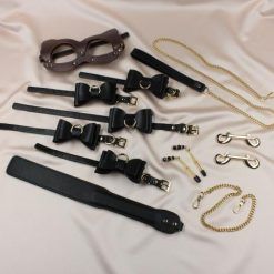 Faux Leather Collar, Wrist, Ankle Restraints & Leash Bondage Kit Gold