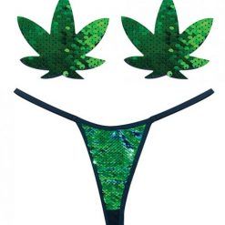 Neva Nude Naughty Knix Weed Leaf Sequin G-string & Pasties – Green O/s