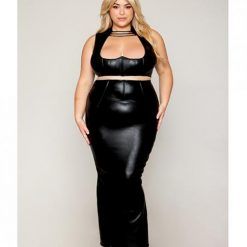 Stretch Faux Leather Harness Bra & Long Slip Skirt – Black Xl