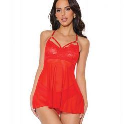 Holiday Scallop Stretch Lace & Mesh Babydoll & Thong Red/gold Xl