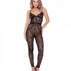 Chantilly Stretch Lace Sleeveless Catsuit W/satin Trim Black Xl