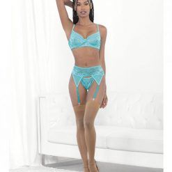 Lace & Mesh Underwire Bra, Garterbelt & G-string Malibu Blue Lg