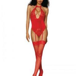 Stretch Lace & Velvet Garter Teddy Lipstick Red O/s