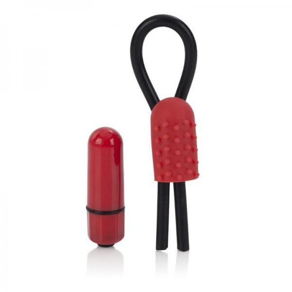 Materials Silicone lasso, stimulator sleeve, ABS plastic stimulator. Batteries included. 3 watch batteries to power up, 6 included. 5 inches adjustable lasso. 2.25 inches by .75 inch bullet vibrator.