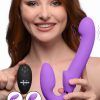 Equip your hips with a dual ended dildo designed for strapless strap-on fun! The G-Pulse offers double ended pleasure for both partners in the form of powerful vibes and clitoral pulsing. This meaty, velvety shaft provides a satisfying fill while staying in place via exclusive Ergo-Fit technology – the inflatable vaginal bulb enables the wearer to find the perfect amount of fill in their vagina to keep this powerful shaft in place while they thrust! The pulsing clitoral pad and G-spot tip gives the G-pulse a blissful feel for you and your partner, while the Ergo-Fit tech lets you play with freedom without a pesky harness for you to worry about. Easily target your partners weak spot with the subtle curved shaft and phallic head, and add in powerful vibes to bring your pleasure to new heights! Choose from 3 speeds and 7 patterns of vibration to send down this phallic shaft, as well as 10 clitoral pulsing actions to stimulate your sensitive clit with every movement of your hips! Control each function with easy to use buttons on the base of this strap on, as well as on the included wireless remote control. Change each function and vaginal bulb inflation with a push of a button to change your playstyle during use! The G-Pulse is rechargeable with the included USB charging cable, and is made with premium phthalate free silicone for a luxurious, velvety, and body safe feel. Designed with IPX6 waterproofing for ease of cleaning and shower friendly use if the mood calls for some steamy fun. Dildo Measurements : Overall length 9.7 inches, insertable length 5.9 inches, widest insertable width 1.7 inches, narrowest insertable width 1.3 inches Vaginal Bulb Measurements : Insertable length 4.5 inches, width 1.5 inches, inflated width 2.1 inches Materials : Silicone, ABS Plastic Color : Purple