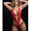 1 Piece Open Front Halter Teddy Red O/S from G World Intimates. One Piece Open Front Halter Teddy comes with jacquard lace featuring silver heart hardware that opens up, a deep plunge neckline and cut out sides meets an irresistiile back, hook and eye closure. One size fits most, Bust 30 inches to 36 inches. A-C cups. Weight 110 pounds to 165 pounds. Waist 24 inches to 29 inches. Hips 34 inches to 39 inches. Sizes 0 to 10.