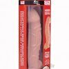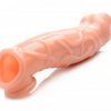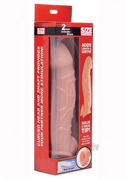 This extender sleeve gives you two whole inches of solid penis to plow into your partner! The realistic texture, featuring a bulbous head and bulging veins, along with a subtle curved shape will deliver a new kind of internal massage. Just lube up and put your entire package through the first hole, allowing your scrotum to go through the bottom hole for a satisfying stretch.