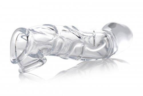 This extender sleeve gives you two whole inches of solid penis to plow into your partner! The realistic texture, featuring a bulbous head and bulging veins, along with a subtle curved shape will deliver a new kind of internal massage. Just lube up and put your entire package through the first hole, allowing your scrotum to go through the bottom hole for a satisfying stretch.