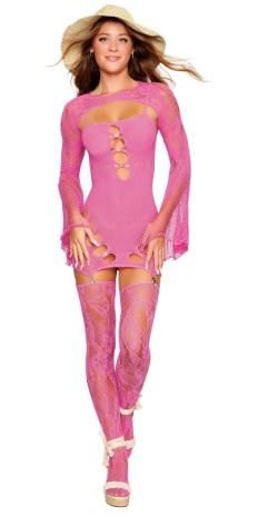 3-piece bodystocking set From DreanGirl LingerieOpaque, seamless garter dress with novelty patchwork-pattern stockings and shrug,Dress has iridescent rhinestone accents, keyhole cutouts, and mini suspender clips for stockings, Novelty patchwork-pattern shrug with wide bell sleeves.