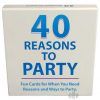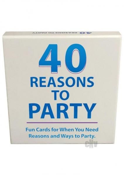 40 Reason To Party adult card game from Kheper Games. 40 Reasons to Party is a set of 40 illustrated cards that give you fun reasons and ideas on how to party. When you feel like having some fun, select a card and display it for your friends. Then carry out the instructions or drinking game rules. Example cards include Because the wine wont drink itself. Go wine tasting! and Someone offered you a penny for your thoughts, and you said you would rather play quarters. Please note the 40 Reasons to drink card games is the upper part of the image. Categories: Party Games, Gifts, Supplies, Adult Gags, Gifts and Novelties, Adult Party Games. 2024.