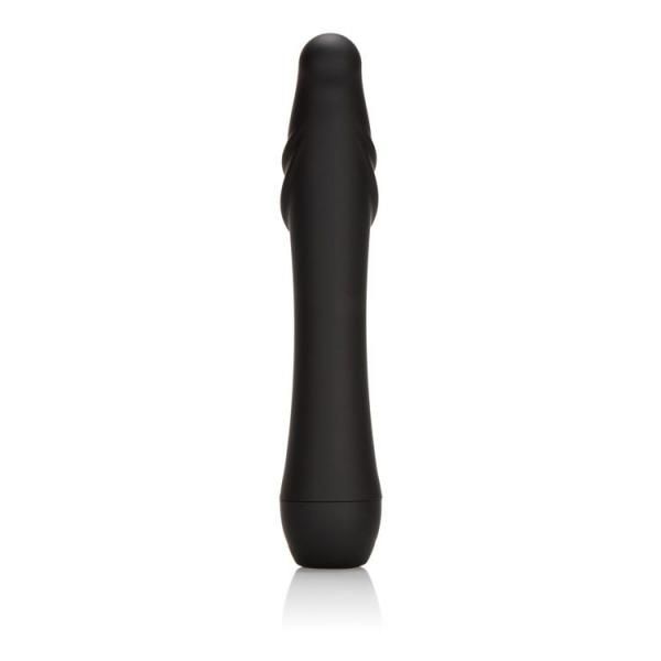 Stimulator with ergonomic ridges and an angled tip for pinpoint prostate stimulation. 5 powerful functions of vibration, pulsation, and escalation. Waterproof, seamless, smooth Rubber-Cote finish, and an easy to use push button control. Vibrator requires 2 AA batteries not included. Length 6.75 inches, width 1.40 inches.