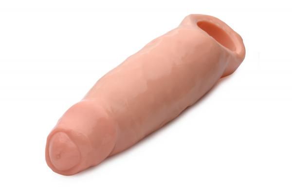 Uncircumcised and unbelievably huge! This long, thick shaft slides easily onto your penis so that you can pound your partner with an all new cock! Soft and flexible, but firm, this extender is made of a realistic material that you can both enjoy. The lifelike shape adds to the fantasy as you delve into ecstasy. This enhancement sleeve also allows you to penetrate for longer, with a frictionless internal tunnel and a snug and secure ball strap. With no shortage of flesh, this slip on dong is uncut, veiny, and enormous so that you and your partner can explore new realms of pleasure!