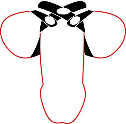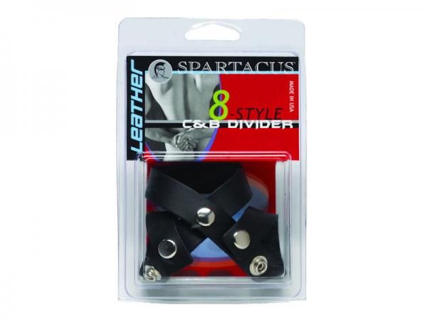Figure 8 style leather cock ring and ball divider, in soft black, soft red, or oiltan black.