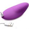 Play in public! This panty vibe is ready to take the town – ergonomically designed to vibe with most body types to provide you a comfortable fit so you can focus on your risky hidden pleasure. Textured nubs adorn the body-facing tip of this vibe to stimulate the clitoris and accentuate the vibration as you move and wriggle during play! Secure this vibe to the inside of your panties, hand over control to your partner, and hit the town – wear this vibe when you go out to eat, grocery shopping, or around the home! Your partner holds the key to your orgasm and can tease you, please you, or deny you the orgasm you crave. Choose from 3 vibration intensities and 5 patterns of vibration. Made with phthalate free silicone for a body safe experience, and designed with IPX7 waterproofing for ease of cleaning and shower free fun. USB rechargeable with the included charging cable. Measurements: Total length 3.75 inches, 1.75 inches at widest Materials: Phthalate free silicone, ABS plastic Color: Purple