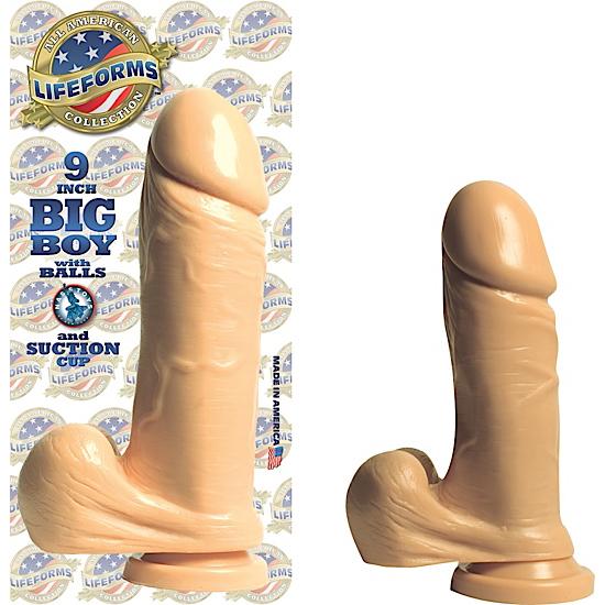 Lifeforms Big Boy with Balls and suction cup 9 inches. Feels like the real thing, with realistic balls and suction cup base. Total length 9.50″Insertable length is 7.25″Head Width is 2.37″Shaft width is 2.50″Circum is 7.75″. Made in the USA