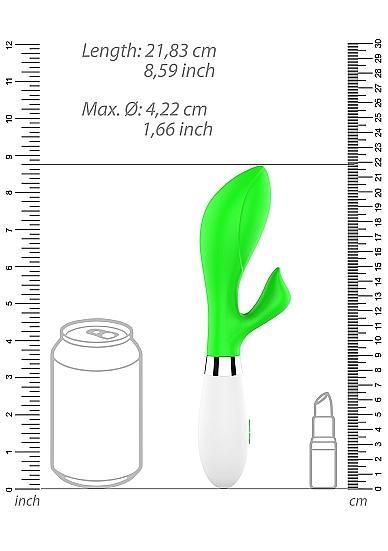 Achelois Ultra Soft Silicone 10 Speeds Vibrator Green from Shots Toys. Red beauty Achelois will please you two ways. The clitoral stimulator is pointed for extra precision, while the insertable part is shaped to touch the inside in all the right places. Offering 10 different speeds at 5200rpm, this vibrator will help you achieve unbelievable pleasure. With little to no sounds <50 dB this beautiful toy can be safely used in private. Made from smooth, phthalate free, medical grade Silicone and ABS Plastic. The Achelois stands 8.6 inches tall, has an insertable length of 5 inches with a diameter of 1.7 inches. So let Luminous color your world, and it will bring stars to your eyes when you reach your best climax yet. This beautiful toy is battery operated. Just put 3 AAA batteries and enjoy a undisturbed pleasurous play time! Specifications: dimensions package 3.94 inches by 1.93 inches by 10.83 inches. Weight package 6.53 ounces. Product dimensions 8.58 inches by 2.76 inches by 2.76 inches. Product weight 5.11 ounces. Product diameter 1.65 inches. Insertable length 5 inches. Quantity motors 2. Rotations per minute 7000rpm. Speed modes 10. Batteries required 3. Batteries type AAA. Batteries are not included. Splashproof. Phthalate free body safe materials Silky Smooth Silicone and ABS Plastic.