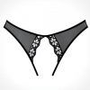 Seduce him with feisty flirtations in this provocative bikini panty featuring an all over sheer mesh with thick sides, an open crotch panel with an ornate crochet lace trim, and an open rear with booty shaping straps.