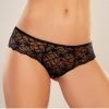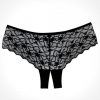 Show your affectionate love in this flirty panty featuring a low cut waist with a thick waist band, an all over sheer scalloped lace, an open crotch panel, and a cheeky cut back.