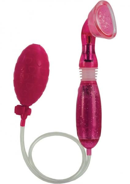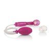 Resonating pleasure. Advanced Clitoral Pump Pink is perfectly contoured for personal intimacy. Advanced design with 3 distinct speeds and a head that flexes for optimum positioning. Use with soft TPR sleeve with tickling teasers. Female pump is made using phthalate free, non-toxic material Thermoplastic Rubber TPR ticklers, ABS plastic handle, PVC hose, Rubber bulb. Suction cup measures 2 inches long by 1 inch wide. Vibrating sex toy requires 2 AAA batteries, not included. Do not leave batteries in the vibrator between uses. Always clean before and after use. Category: For Women, Vibrators, Stimulators. Advanced Clitoral Pump is a registered trademark for California Exotic Novelties. Sex toys and sexual wellness.