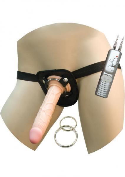 Real skin 7 inches vibrating dong 3 powerful speeds Suction cup base Harness fits any dong Compatible with all Nasstoys Whoppers and Lifelikes. Adjustable straps for a custom fit. Two ring sizes included. Materials Dong PVC, Remote ABS plastic, Harness polyurethane PU, Rings Metal. RoHS compliant. Vibrator requires 3 AA batteries, not included.