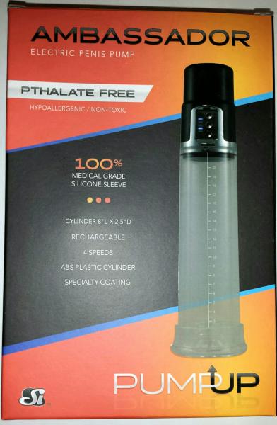 Ambassador Pump from SI Novelties. Electric Penis Pump. Includes: Electric Pump, Cylinder 8 inches in length by 2.5 inches width. Silicone Sleeve. USB Charging Cable. Extra Rubber O-Ring. Hypoallergenic, non-toxic. Phthalate free materials 100% medical grade Silicone sleeve. 4 speeds. ABS plastic cylinder. Pump up!