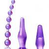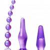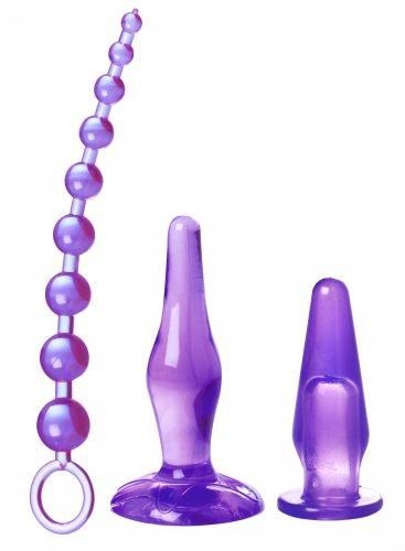 Measurements large butt plug 5 inches in total length, 4 insertable, 1.25 inches in diameter. Small butt plug 3 inches in total length, 2.5 insertable, 1 inch in diameter. Anal beads 11 inches in total length, 9 insertable, 1 inch in diameter at widest point. Material Thermoplastic Elastomers TPE. Color Purple. Note anal toy kit contains 3 anal toys.