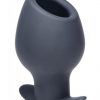 Made of premium silicone, this butt plug is non-porous, phthalate free, and easy to clean with mild soap or toy cleaner. Avoid use with silicone lubricants. Measurements 4.4 inches in length, 2.65 inches at widest diameter. Opening diameter is 1.25 inches. Material Silicone. Color Black.