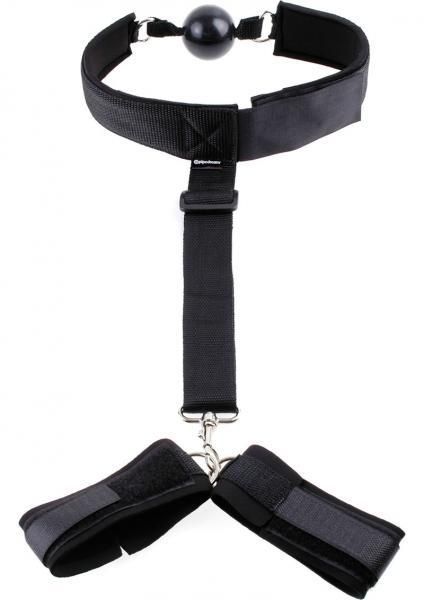 Fetish Fantasy Series Gag and Wrist Restraint Black. If you are looking for the ultimate all in one beginner bondage essential, look no further! The Fetish Fantasy Gag and Wrist Restraint will keep your lover gagged, bound, blinded, and under total control. The comfortable gag head strap easily adjusts and features a nylon neck to wrist restraint strap that connects to the cuffs in the back. With your subjects hands cuffed behind their back and their mouth open and gagged, you can explore unlimited fantasies without them ever saying a word or escaping.