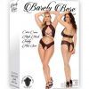 This open design teddy teases the eye with a criss-cross strappy look at the front and a thong bikini profile at the back. With a high neckline and cups that embrace on a dramatic angle, the crotchless panties complete the ensemble with an alluring V-shape and single string thong leading down from a waist-hugging panel. Made from stretchy black and red lace brocade with nylon straps. Cross body red and black lace brocade teddy. High neck, open front and back design. Open cup design connects with back bra strap. Strappy criss-cross over breasts and belly. V-shaped crotchless panty with waist-hugging panel. Single string thong for bare buttocks look. Body-hugging stretchy lace brocade. No underwire. Hand wash. Polyester and elastane blend. Plus size and stretchy for comfortable fit.