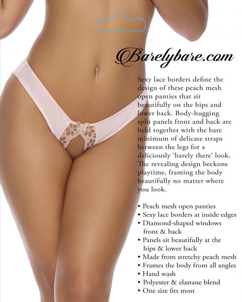 Sexy lace borders define the design of these plus size peach mesh open panties that sit beautifully on the hips and lower back. Body-hugging split panels front and back are held together with the bare minimum of delicate straps between the legs for a deliciously and barely there look. The revealing design beckons playtime, framing the body beautifully no matter where you look.