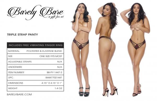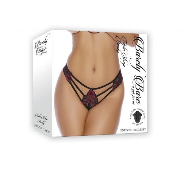 Barely Bare Triple Strap Panty O/S from Evolved Novelties. Triple Strap Panty Barely Bare SKU: ENBBPY14472. UPC: 844477021447. These Black and Red Lace Brocade Strappy Thong Panties have feminine appeal with a diamond shaped panel at the front that fans out to a three strap design leading up to the hips. Scalloped side panels sit up high and connect with the Barely There Triple Strap design at the lower back. A single string Thong completes the look with beautifully framed exposed buttocks. Features: Black and Red lace Brocade Strappy Panty. Diamond shaped front panel. Scalloped edge side panels at the hips. Triple straps at the lower back and groin. Single string Thong for Barely There buttocks look. Made from Stretchy Lace Brocade and Nylon straps. Fabric Polyester and Elastane Blend. One size fits most. Categories: Lingerie, Clothing, Women’s Underwear, Naughty Role Play. 2024.