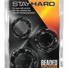 Blush Novelties Stay Hard Beaded Cock Rings are super stretchy, phthalates free and include 3 sizes. Wear all 3 rings at the same time for maximum effect. Perform like the stud you are! These Stay Hard Cock Rings come in 3 sizes, so you can use them individually or all 3 at once. The Small Ring is for maximum erections; Medium Ring is for hard erections; Large Ring can be used to encircle the upper part of your scrotum to help prevent premature ejaculation. They are made of Elastomer, a super stretchy, comfortable and Phthalate Free material developed specifically for your safety and hygiene during your intimate play. So, if you are looking for a safe way to increase both in size and stamina, you and your partner are sure to enjoy Stay Hard Cock Ring and your bigger, better erection that lasts even longer!