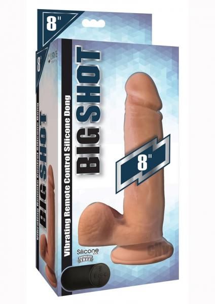 Big Shot 8 inches Vibrating Remote Control Silicone Dong with Balls Vanilla Beige from Curve Toys. 21 Function for maximum pleasure. Vibrating Liquid Silicone Dong with strong suction cup base. Harness compatible. Ultra durable with perfectly sculpted life like dong.