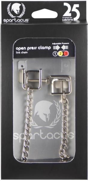 Black Adjustable Press Nipple Clamps from Spartacus Leathers. A good fit for practically any nipple, Press clamps offer a wide range of adjustability for a full palette of sensations. Spartacus Press clamps adjust fluidly and effortlessly, allowing for precision adjustments in intensity. This unique single piece nipple clamp works like little press. Turn the thumb screw to tighten. The tighter, the more painful and the less slippage. Weight 0.18 pound. Black Adjustable Press Clamp. No body piercing required. Non-piercing nipple clamps.