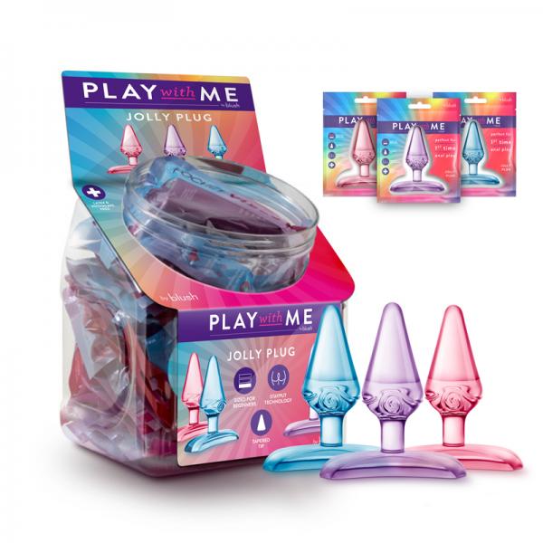 The Jolly Plug from Blush is the perfect anal toy for beginners if you’re just experimenting with your pleasure or if you have been hesitant to try anal play. This large fishbowl display Contains 24 Pieces – 8 of Each Color (Pink, Purple, and Blue). Each plug is individually wrapped and has a tapered tip for easy insertion. They are small enough for long-term wear and comfort during anal training. The Jolly Plug has StayPutâ„¢ technology for security, ensuring it will stay in place when you play. The flared base ensures your safety during use and the fun colors bring a little something extra to your wellness routine!