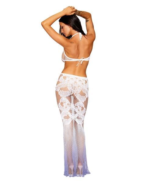 Bodystocking Gown White, Hydrangea O/S from Dreamgirl Lingerie. Seamless bodystocking gown with custom designed lace pattern and two tone ombre color. Deep plunge neckline with gold O-ring connector. G-String Panty not included.