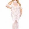 Bodystocking Gown White Q/S from Dreamgirl Lingerie. Features a custom designed lace pattern and fishnet insets for an intricate and unique look. Turtleneck design with a fit and flair fishnet hem adds a touch of sophistication and style. Includes separate fishnet flutter sleeves for versatile wear options and added flair.