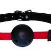 Strong, sturdy and yet very comfortable. The red stitched fabric strap adjusts with a buckle while the breathable ball is a great size for beginners. Measurements ball gag diameter 1.75 inches, one size fits most. Fabric strap.