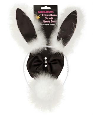 This 3 piece bunny set includes black satin bunny ears trimmed with white faux fur on an extremely comfortable to wear headband, a black satin bow tie and a white fluffy bunny tail.