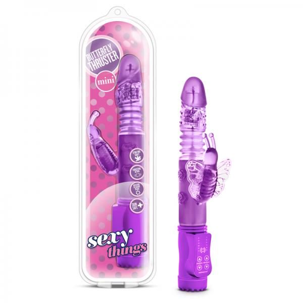 Sexy Things Butterfly Thruster Mini Rabbit Vibrator Purple. This Butterfly Thruster Mini is anxious to flick, flutter, vibrate and thrust its way straight to your heated cocoon! Featuring reversible rotating pleasure beads and soft sensual gyrating and thrusting shaft, oh do not forget the monarch of a butterfly vibrating your clitoris! This vibe boosts three times the endless erotic possibilities yet to cum and just screams, come play with me.