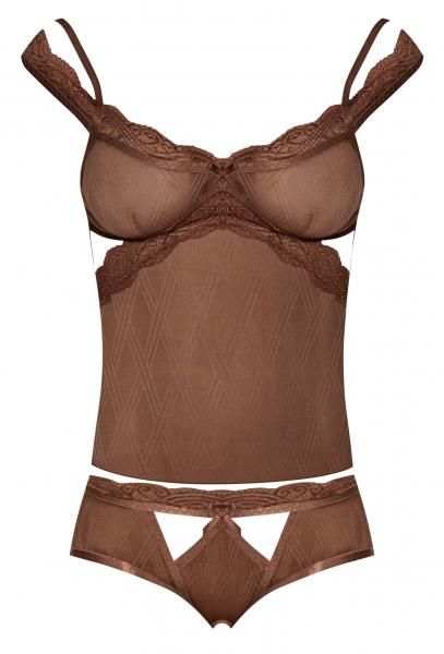 Caramel Kiss Cami and Split Crotch Boy Shorts Caramel L/XL from Magic Silk Lingerie. Magic Silk Cami & Split Crotch Boyshort M275. Colors Caramel Brown. Sizes: S/M, L/XL, Queen. From the Exposed by Magic Silk Collection, this style includes: a cami featuring cutout designs on each side, lace trim in the front and sides, adjustable shoulder straps with gold tone sliders in a lace and elastic 2 strap design on each side, and a matching crotchless lace trimmed panty, with a peek-a-boo design in the front, in a boyshort style. Stretchy jacquard mesh and soft lace in caramel with sleek gold metal hardware. Sizes: 12 to 18. Fabric content: 90% Nylon, 10% Spandex. Care hand wash cold water. No bleach. Dry flat. Magic Silk Lingerie – Caramel Kiss. Categories: Lingerie, Clothing, Naughty Role Play, Babydolls, Slips. 2022.