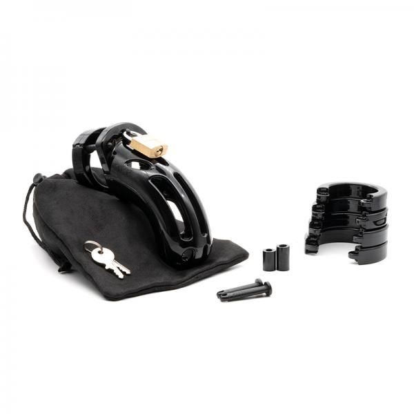 The Curve Male Chastity Device is designed for the larger male. The Curve is newly updated to incorporate the larger cage of the classic Curve model and the innovative ring design of the CB-6000. The rings consist of three interlocking pieces that fit together like a puzzle. The two guide pins hold the top pieces together. The oval locking pin goes through the middle recessed hole connecting the cage portion to the ring. The flat design of the rings is extremely comfortable and secure. The Curve is made of medical grade polycarbonate material. It is lightweight, hypoallergenic and durable. The cage portion is vented for hygiene and has a bottom opening allowing use at urinals. The different size rings and spacers included in each package allow you to customize your fit to your individual needs. The Curve restricts you from touching your genitals for sexual pleasure and gives the Keyholder control over the sexual fulfillment of both partners. Includes: 1 cage portion; 5 different sized rings; locking pins and spacers; one brass padlock; five individually numbered plastic locks. It also comes with a handy black zippered carrying case.