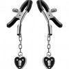 These easy to use clamps have a simple screw down design, accented with heart shaped padlock detailing. The vinyl coated tips allow for a comfortable and secure grip while the black lacquered heart accent dangles enticingly from the end. The screws on the sides allow you to control just how much pressure your partner receives.