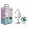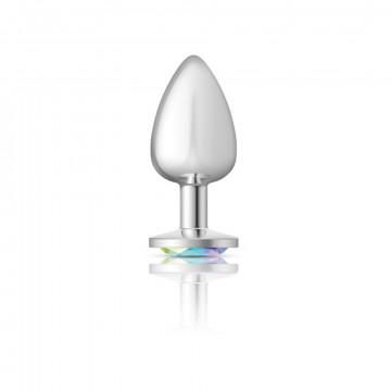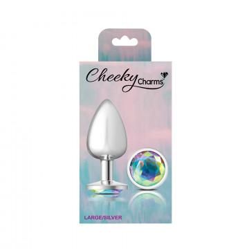 Cheeky Charms Round Clear Iridescent Large Silver Butt Plug from Viben. Cheeky Charms is a collection of vibrant, seductive metal anal plugs, each show casing a beautiful Acrylic Gem Stone. These butt plugs are great for temperature play and anyone who wants to decorate their rear entrance. Tapered for easy insertion and designed with a flared base and thin stem. Cheeky Charms anal plugs are comfortable to wear for an extended period of time. Wearable during intercourse to achieve a fuller feeling. Available in various unique colors and sizes. Cheeky Charms are the perfect booty jewelry for women, men, couples and also for solo play. Large, silver metal, tear drop shaped anal plug with sparkling Iridescent colored, round Acrylic Gem Stone. Hypoallergenic, nonporous, body safe, Nickel free, Aluminum alloy, anal jewelry compatible with all lubricants. Easy to clean and dishwasher safe butt plugs. Available in various colors and three different sizes. Specifications: body safe materials. Nonporous, smooth surface. Aluminum Alloy. Nickel free. Ideal for temperature play. Never warm in a microwave. Run hot water and Aluminum place plug to warm. Or a chilly butt plug in a tub of ice. Tapered, tear drop shape. Thin Stem. Flared Base Anal Plug. Clear Iridescent Acrylic Gem Stone. Light weight. Easy to clean. Waterproof, non-vibrating anal sex toy. RoHS Certified, Prop 65 Compliant. 1 year Limited Warranty. Measurements: overall length 3.72 inches, insertion length 2.39 inches, circumference 5.25 inches around. Material: Aluminum Alloy Butt Plug, Acrylic Gem Stone. Categories: Anal Toys, Prostate Massagers, P-Spot Stimulators, Sex Toys for Couples, Health and Beauty Aids, Large, Huge Butt Plugs. Restricted, Amazon Restricted. 2022.