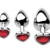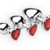 Ready for more anal pleasure? This set of three metal plugs is perfect for backdoor exploration! These beautiful butt plugs were designed to make anal play comfortable, exciting, and stimulating. Graduated in size, the plugs start out very small and increase at a comfortable interval. The tapered tip and smooth, seamless material create an easy insertion. The heart shaped jewel at each base makes these butt plugs perfect for surprising your partner for a night in, but they are comfortable enough to wear long term if you decide to go out first!