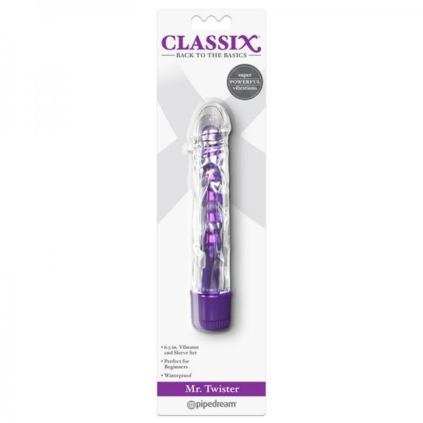 With his crystal clear sleeve and shiny metallic insides, Mr. Twister is the right man for the job! Turn the dial on the multi-speed base and let the powerful vibrations whisk you away! The soft, body safe sleeve has a veiny swirl texture, lifelike head, and tiny ticklers for extra stimulation. Best of all, the removable sleeve can be used as a penis extension and the beaded vibe can be used alone for vaginal or anal play. Cleanup is a snap after the fun with toy cleaner and warm water. Perfect for beginners 6.5 inches. Vibrator and Sleeve Set Waterproof. Dimensions length 6.5 inches, width 1.3 inches, girth 4 inches, insertable length 5.5 inches. Package depth 1.1 inches, width 3 inches, height 11.25 inches.