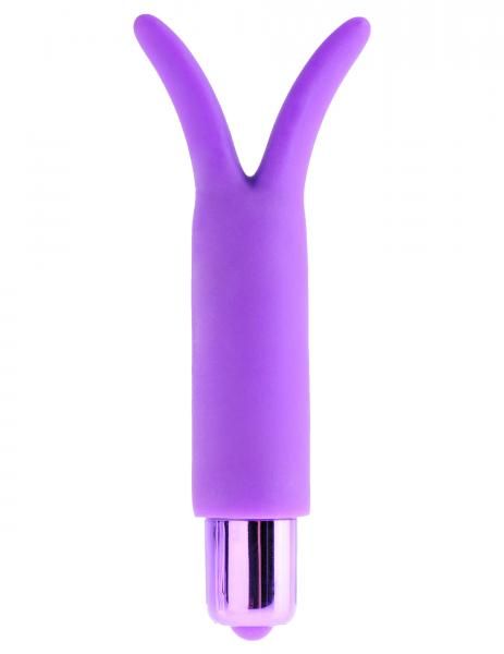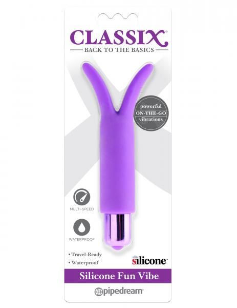 Classix Silicone Fun Vibe Purple from Pipedreams. Perfect for first timers, this ultra smooth Silicone Fun Vibe offers powerfully satisfying 3 speed vibrations with the push of a button. Flickering ears tickle and tease sensitive erogenous zones, while the tip of the bullet provides pleasing pinpoint stimulation. Try it in the spa or shower and turn bath time into pleasure time! Features multi-speed. Waterproof vibrations. Travel friendly. Size 5 inches by 2 inches. Vibrator requires 1 AAA battery, not included. Materials Silicone sleeve, ABS plastic bullet vibrator.